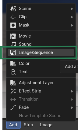 To import an image sequence, a single image or even a video file, use the Add option above the video timeline.