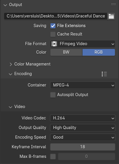 Further down under output, pick your destination directory and give your video a name. Under File Format, choose FFmpeg Video, then choose a Container (MPEG-4 will create an MP4 file). You can also set the video codec and quality in this section.
