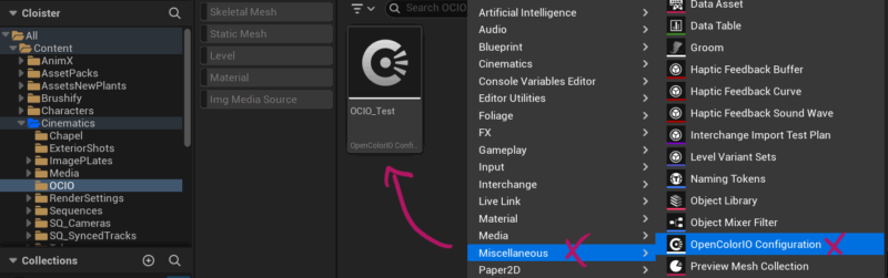 Right-click in the content browser and create a new OCIO profile. You’ll find it in the Miscellaneous category.