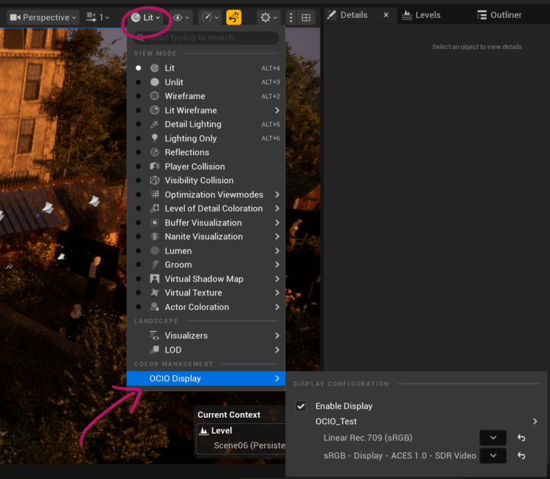 Open the View Mode menu (the one that typically says “Lit”, top left in Unreal Engine 5.5 and below, or top right in 5.6 and above). In the last entry that reads OCIO Display, enable it and pick your colour profile.