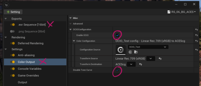 Note that it is recommended to disable the Tone Curve option. This will allow for linear exposures that are easier to colour correct in compositing. Also note that when using OCIO, the Tone Curve will be disabled by default in UE 5.6 and above. In earlier versions this can be set independently.