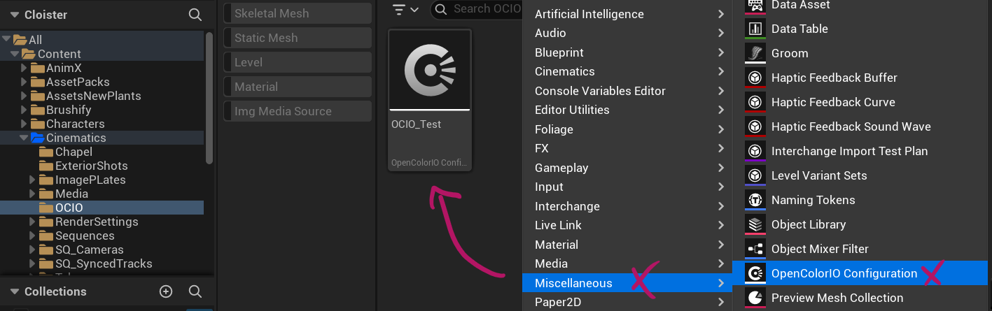Right-click in the content browser and create a new OCIO profile. You’ll find it in the Miscellaneous category.