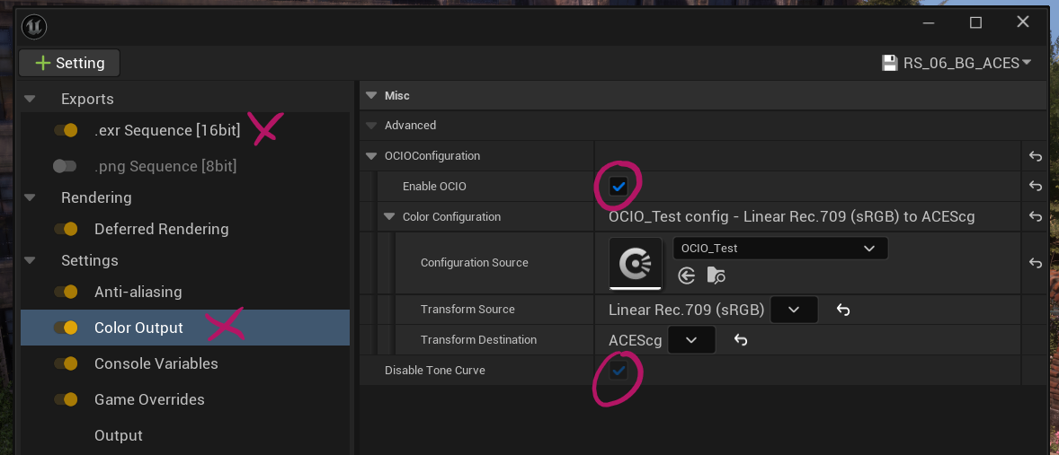 Note that it is recommended to disable the Tone Curve option. This will allow for linear exposures that are easier to colour correct in compositing. Also note that when using OCIO, the Tone Curve will be disabled by default in UE 5.6 and above. In earlier versions this can be set independently.