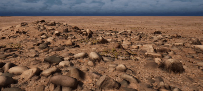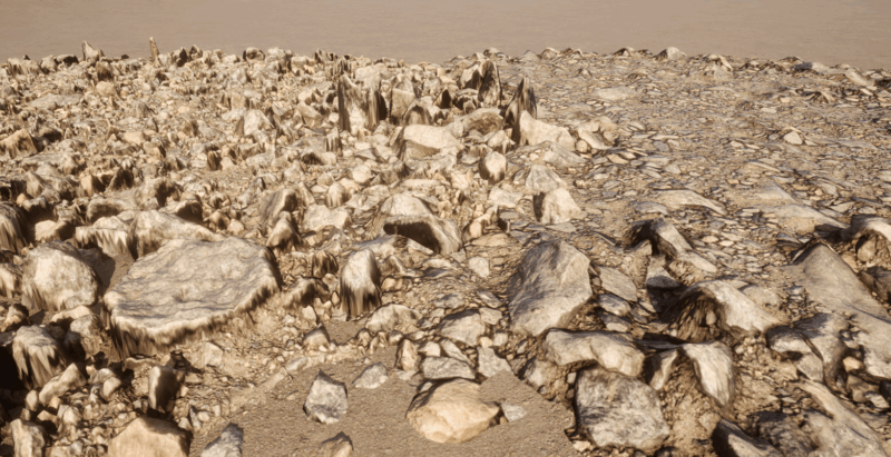 Landscapes in Unreal Engine typically don’t have a lot of detail. For close-up shots, we usually have to place static meshes manually or use foliage painting tools, but it can be time consuming to get right and tricky to change later. PCG Geometry Decals makes this a breeze: These decals project a texture onto a piece of circular geometry that’s subdivided, snapping to the landscape object, providing high-res detail where we need it. Moving the decals is super easy and they auto-snap to a sculpted landscape.