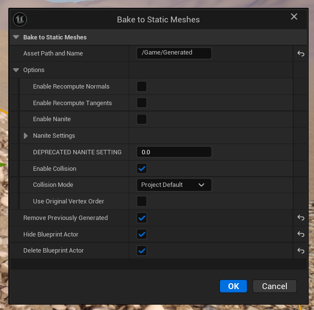A context menu with options will appear that lets us specify a destination for the generated meshes, whether we’d like to remove the decal object or just hide it (for potential adjustments down the road), very detailed Nanite options and several other useful settings.