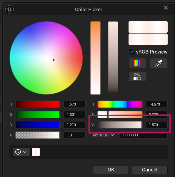 In case the lightest value isn’t quite light enough, feel free to crank up the V value in the color picker above its max value of 1 by typing in a higher number like 2, then adjust down from there.
