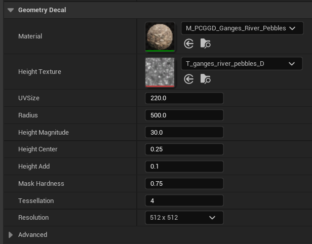 The Material and Height Texture fields are the Material instance and displacement map for the decal. This is where you would add your own textures (make sure they’re tileable). Right below we’ll see the UV Size, which determines how large the texture appears after projection. The Radius parameter determines how large your decal circle will be (note that the scale and rotation transforms won’t work)