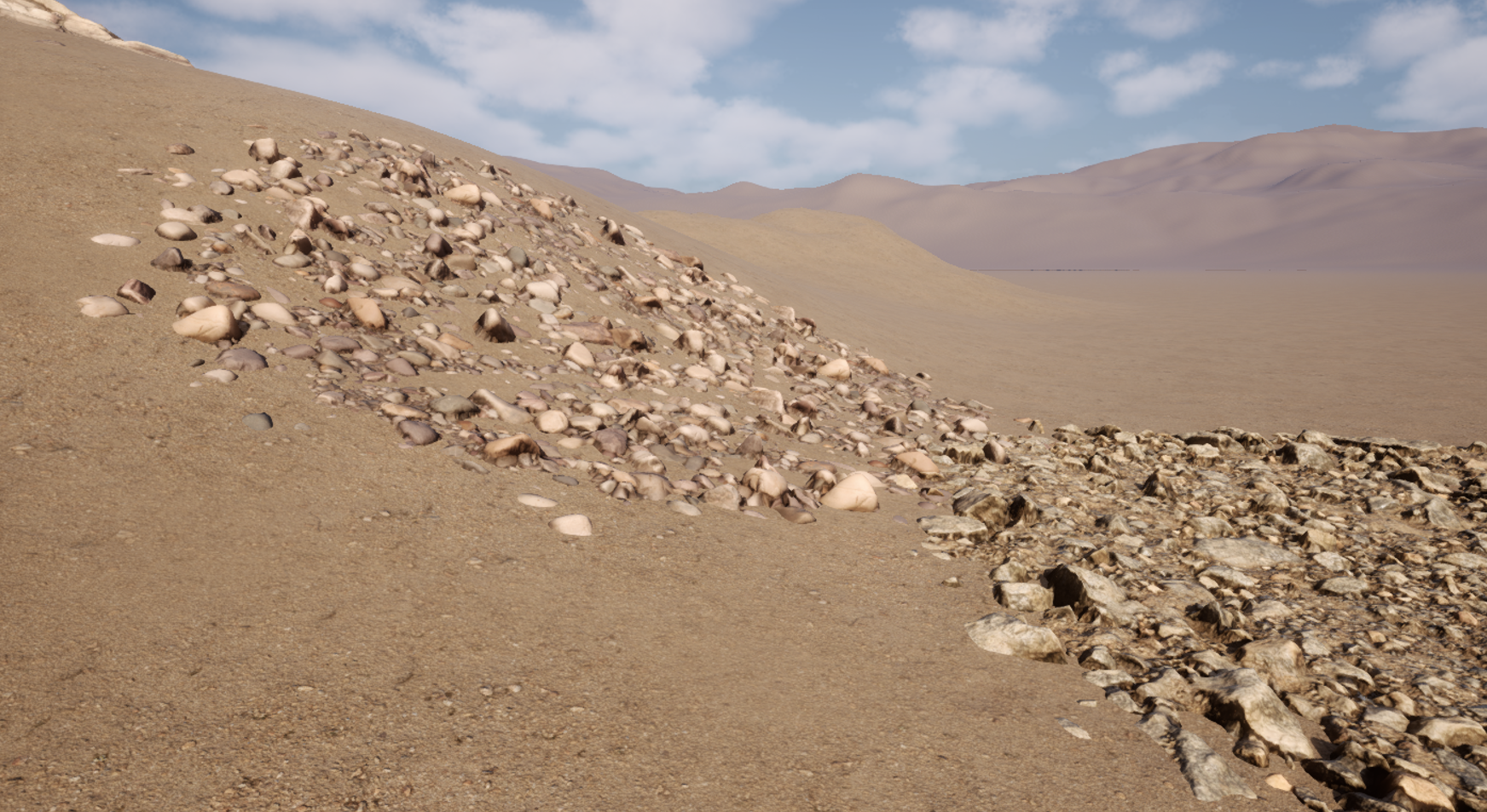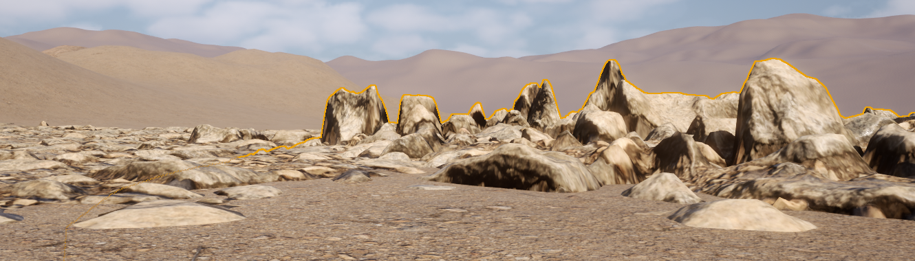 Landscapes in Unreal Engine typically don’t have a lot of detail. For close-up shots, we usually have to place static meshes manually or use foliage painting tools, but it can be time consuming to get right and tricky to change later. PCG Geometry Decals makes this a breeze: These decals project a texture onto a piece of circular geometry that’s subdivided, snapping to the landscape object, providing high-res detail where we need it. Moving the decals is super easy and they auto-snap to a sculpted landscape.