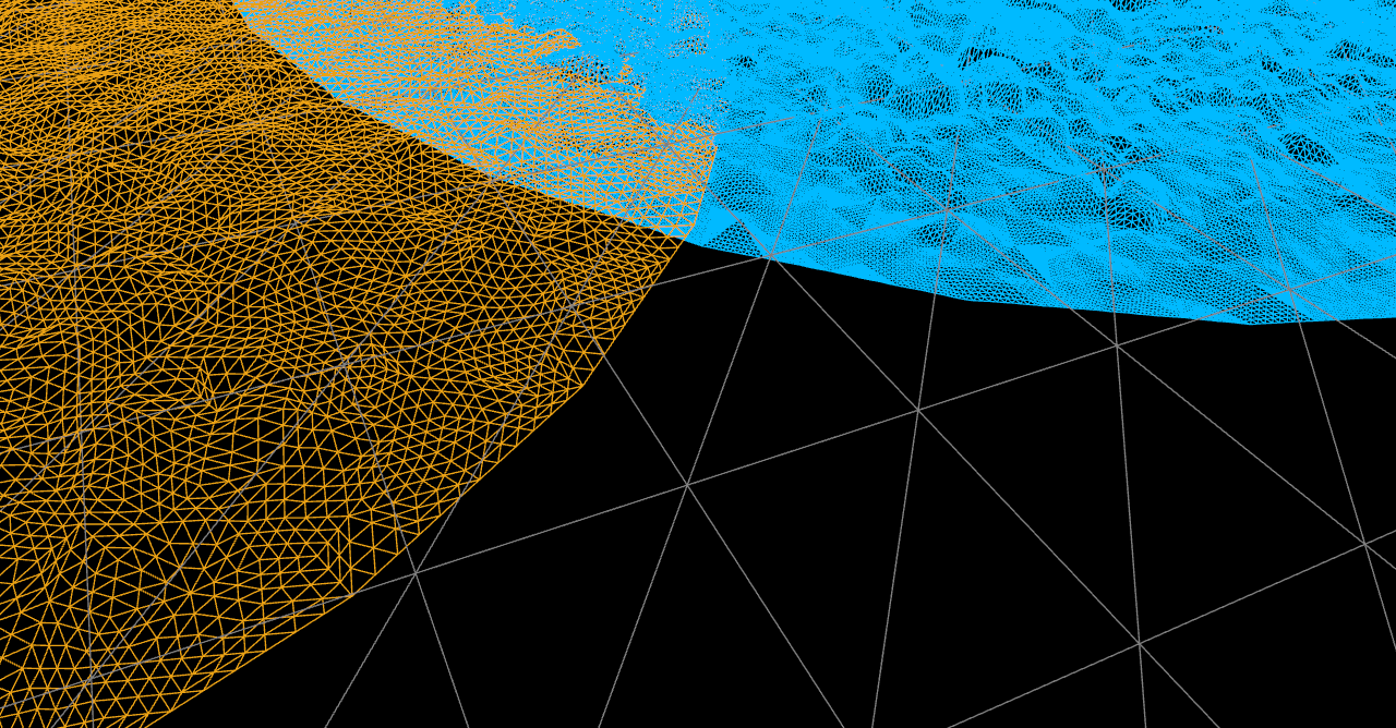 Tessellation is the subdivision of the geometry that’s created from the projection. A higher value means the geometry will be able to resolve detail better. A good result here will depend on the source texture and its resolution. Here’s he same decal in wireframe mode, on the left with Tessellation set to 2, on the right with 8 (default is 4). Also note the landscape resolution by comparison.