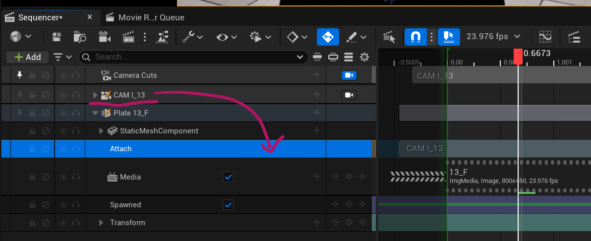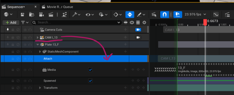 I keep forgetting how to set this up, so here’s how to do it. I’m assuming here that this will be used as part of a shot (i.e. separate level sequence), so both the camera and the media plate are spawnables. They don’t have to be, but using spawnables allows for much greater flexibility when setting up a master sequence.