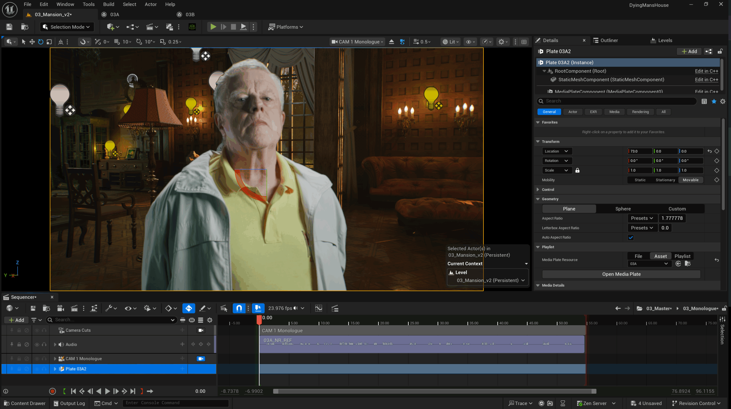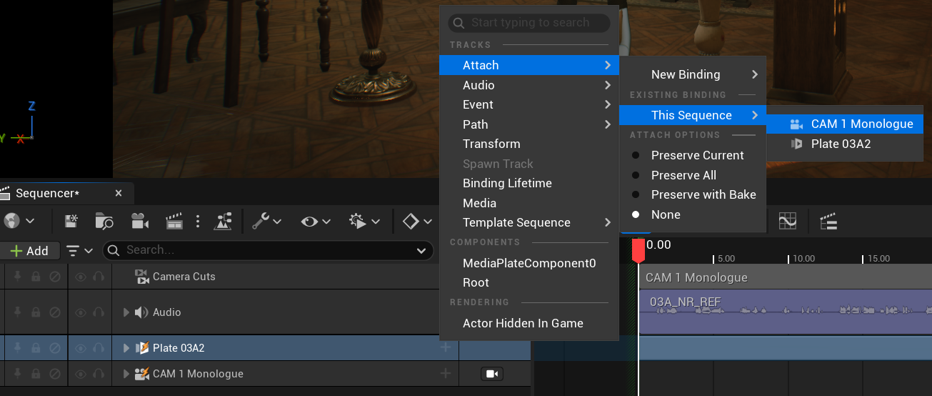 We work a lot with animated image plates, typically of rotoscoped actors (Unreal Engine calls them Media Plate Actors). That way we can position and integrate them into the 3D world. One of the hard parts is moving the camera to a different position while leaving the plate sizing intact as we make changes to our shots. The easiest way to accomplish that is by attaching the media plate actor to the camera. That way, when we move the camera, the plate stays in exactly the same position while the environment changes around it.