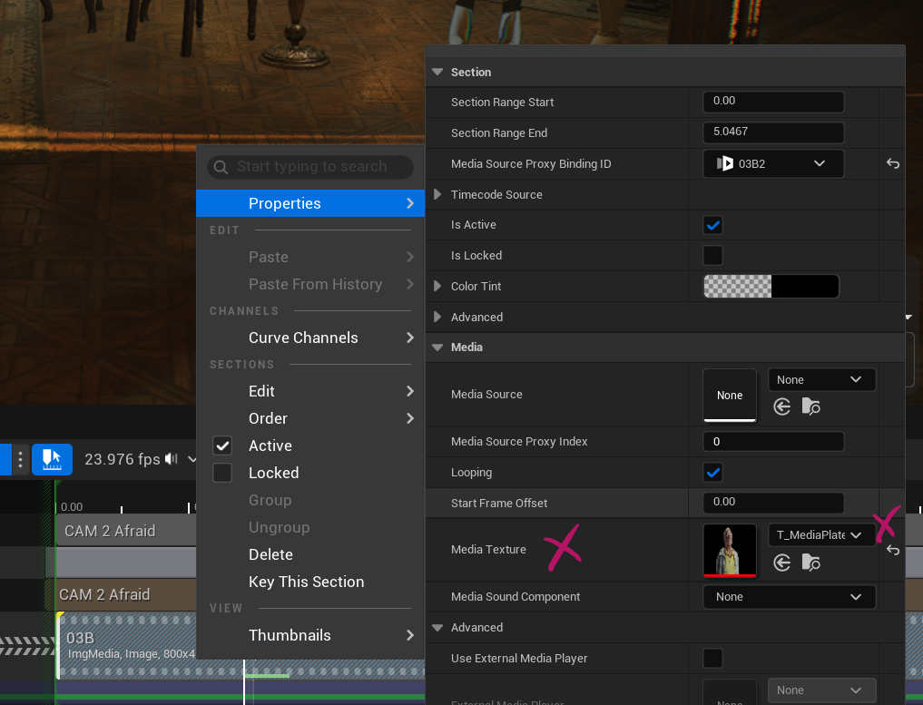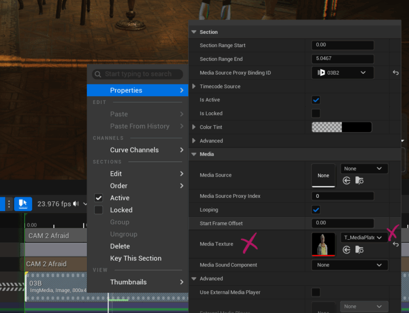 Image Plates tend to get a little funny when you turn them into spawnables in Sequencer. For one, they lose their media texture, even though they were perfectly working as posessable actors. Once spawnable, we need to tell UE that we want to use T_MediaPlate under Media Texture.