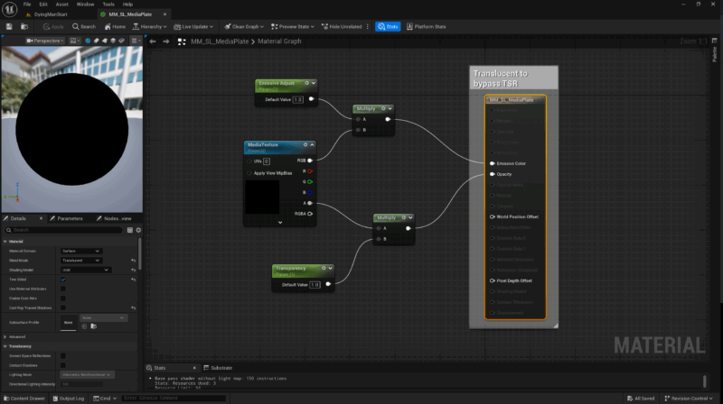 I’ve made my own copy of the translucent engine material (found in Engine/Plugins/Media Plate Content) so that I can make adjustments in sequencer. Here’s what it looks like:
