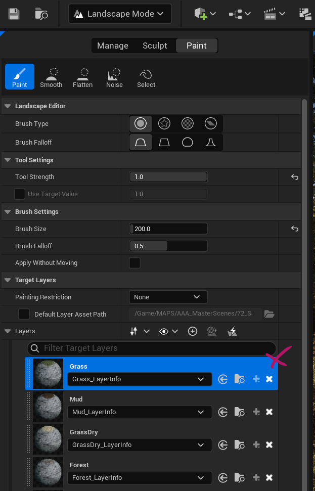 Each landscape layer’s layer info gives a clue where to start your reverse-lookup research. Select the landscape, then switch into landscape mode and select the paint option to expose the layers. In my case, I was after Grass_LayerInfo.