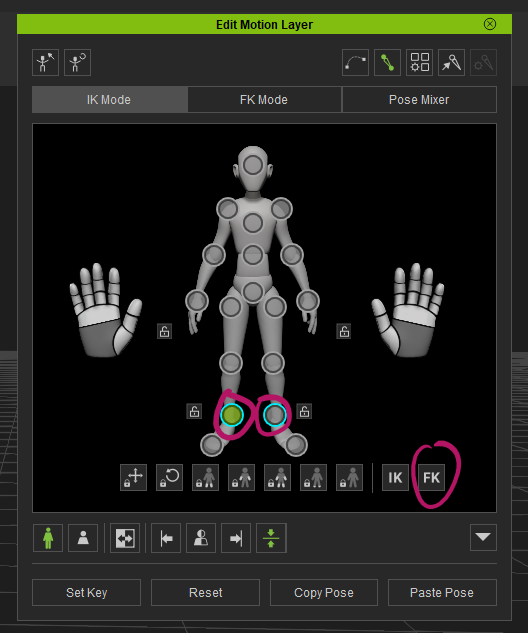 To correct the pivot point origin, I’ll move my playhead to the first frame of the animation, then switch to the Edit Motion Layer tool. Select each of the foot locks and switch them from their default IK to FK. This will allow us to make hip adjustments that will affect the whole figure without keeping the feet in place.