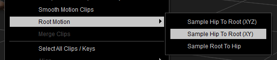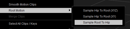 I’ve looped my clip from a few segments, and when I watch the pivot point now, I’ll see it re-position itself every so often. For a single mocap take, the pivot point may stay in the same spot, but in either case, it’s currently not travelling with the character. Let’s transfer the forward motion of our character to the hip bone so it’ll be independent from the pivot point. To do this, right-click the clip and choose Sample Root to Hip (under Root Motion).