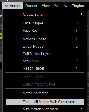 Finally, and because we’ve made a Motion Layer adjustment, we need to bake that information back into the keyframes. We can either select a Collect Clip and save out the motion, or head over to Animation – Flatten All Motion with Constraint.
