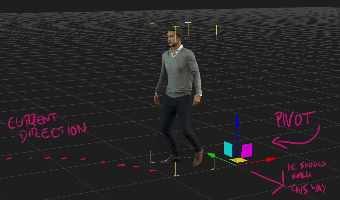 When I set the Z rotation to zero, Kevin will walk in a straight light. That’s a great start, but his pivot point is still not in his centre. Let’s fix that next.
