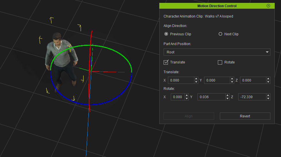 To fix this, I’ll select the clip on the timeline (previously imported with Motion Alignment disabled), then right-click and choose Motion Direction Control. I’ll bring up a blue line showing us where my character is heading, as well as numeric rotational values for the current clip’s direction.