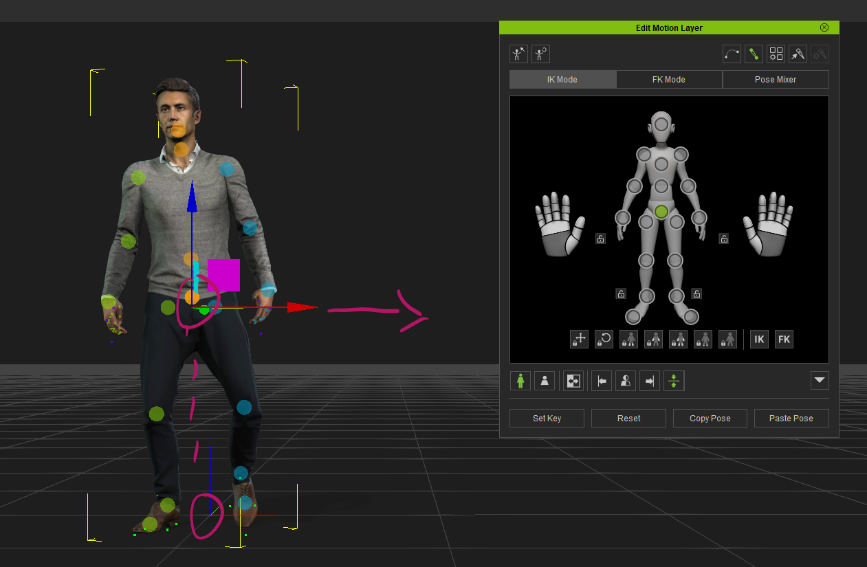 To correct the pivot point origin, I’ll move my playhead to the first frame of the animation, then switch to the Edit Motion Layer tool. Select each of the foot locks and switch them from their default IK to FK. This will allow us to make hip adjustments that will affect the whole figure without keeping the feet in place.