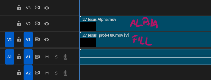 Let’s stack up the footage so that the fill (image) is on track 1, and the alpha (cutout opacity) above it on track 2.