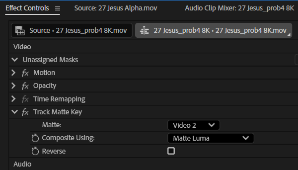 In the Effect Controls panel, we select the track we want to use as our matte (Video 2 in my case). This makes our footage visible. Now switch Composite Using from “Matte Alpha” to “Matte Luma” and it’ll punch out the opacity.