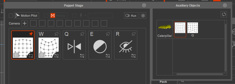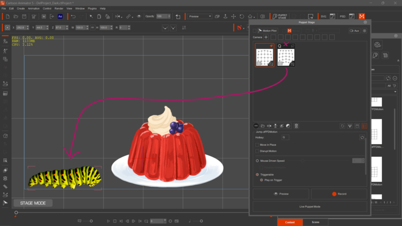 For my simple scene I have a wiggly jelly desert, and a caterpillar. Each object is a prop with their separate idle motion. One hotkey is setup so they both trigger a different animation.