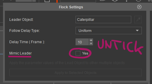 To make them work simultaneously and obey their individual animation cards, we must take a look at the Flock Settings of the follower object(s). Let’s say the pudding is the leader, and the caterpillar is the follower. Select it and click on the icon with several little dots (I suppose one large dot is being followed by several smaller ones).