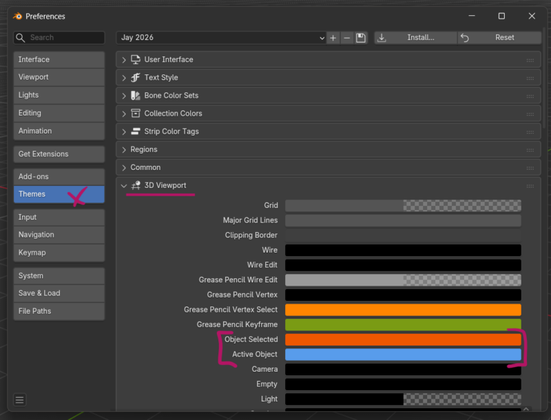 I remember changing my active highlight colour in Blender a while ago, and naturally can’t remember in which abyss of the menu madness this setting was buried. I did this because by default the highlighted and active object have a very similar shade of orange, making it nearly impossible for my dyslexic brain to see where I’m copying to or from. The easiest way was to change one of those colours to blue, as shown above.