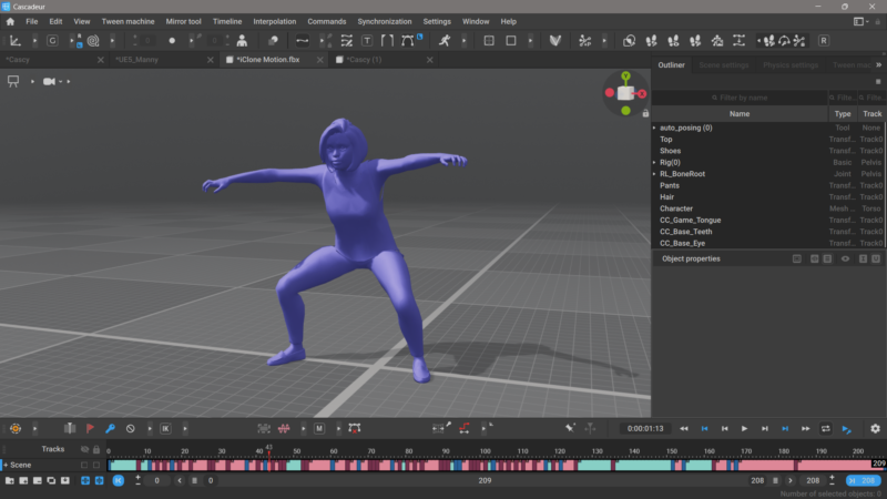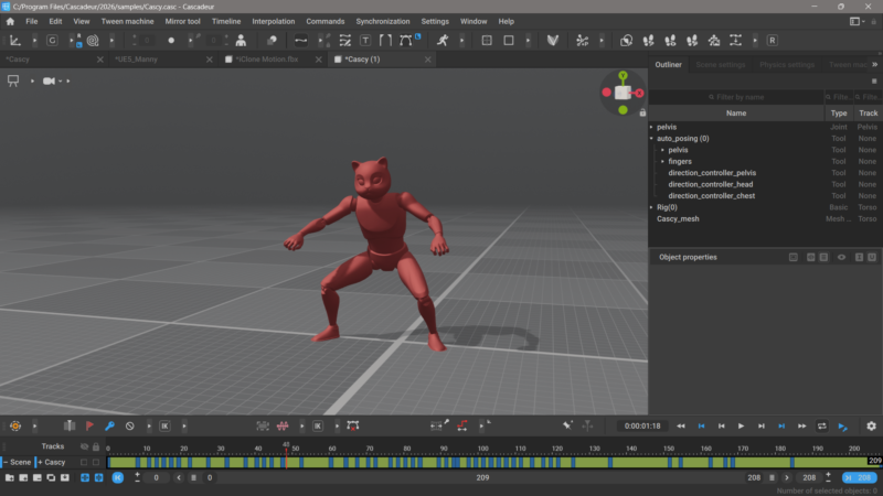 Next, let’s open a new scene with a new character. I’ll pick the Cascy mannequin here from the Cascadeur library, but any figure will work as long as it’s been setup with Cascadeur’s rigging helper tool.