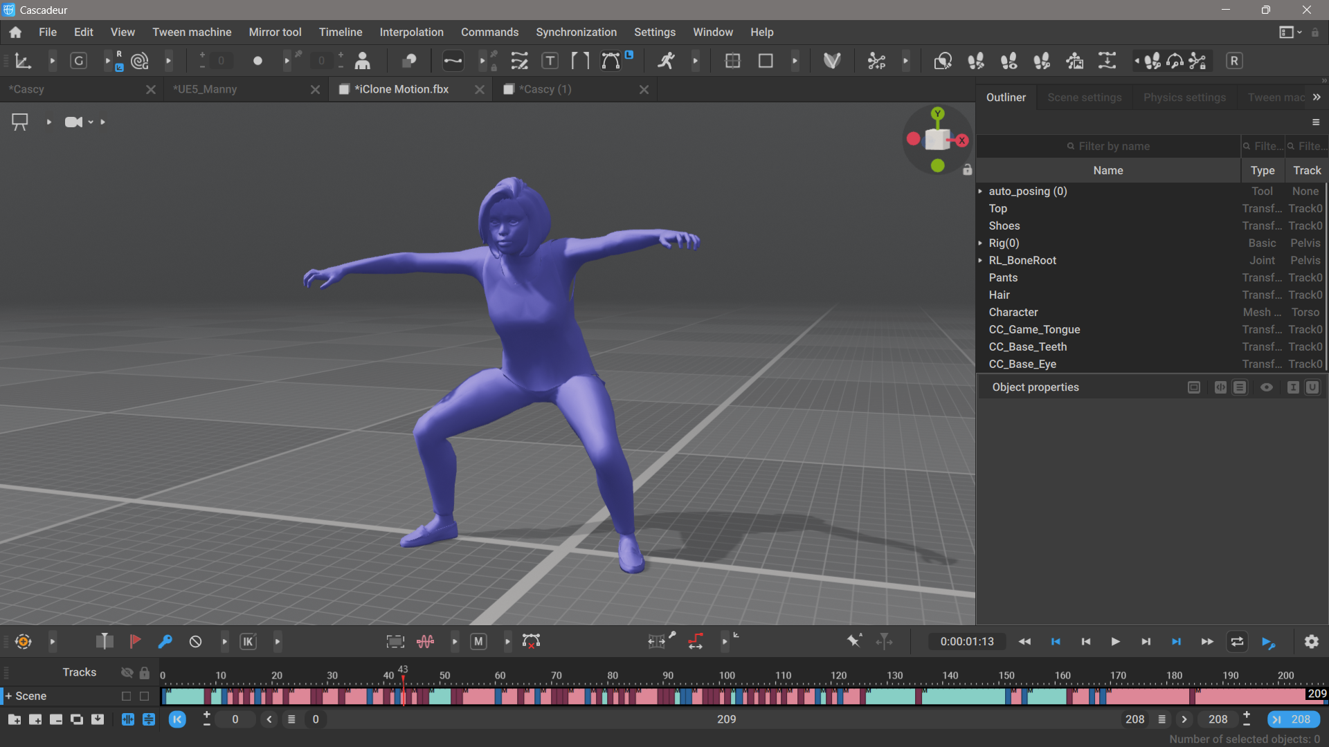 I’ll use my previous Battle Dance animation with a Reallusion ActoCore figure in Cascadeur 2026.1. Let’s select all keyframes on the timeline by left-clicking and dragging on them. In my case that’s all 208 frames, but it could be as little as a single frame.