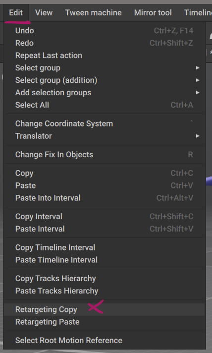 Next, head over to Edit – Retargeting Copy (at the very bottom of the long list). A message should appear briefly in the viewport to confirm the operation.
