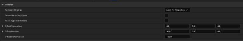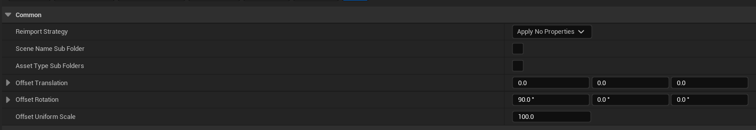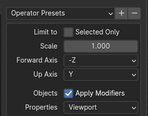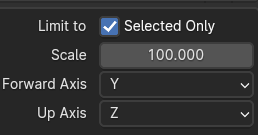 This will lead to objects being 100th of their size when imported into UE, and turned onto their sides. If we apply the following on export, the import will look good (provided we use default import settings):